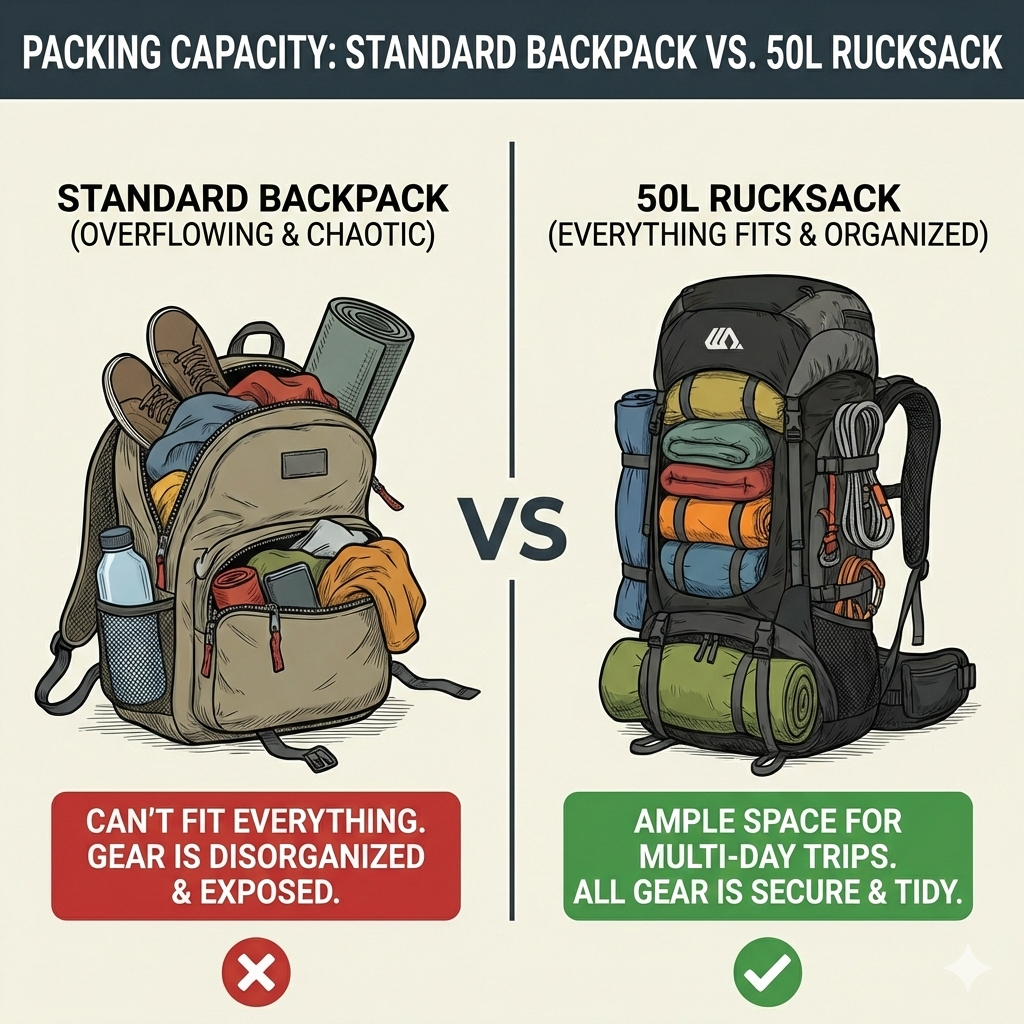 Pack for the long haul with the 50L Waterproof Mountaineering & Travel Rucksack. Whether you are scaling a peak or backpacking across Europe, this 50-liter powerhouse offers the perfect balance of capacity and agility. It provides enough room for sleeping bags, clothing, and climbing gear for a multi-day trip, yet remains streamlined enough to function as manageable luggage for air travel.