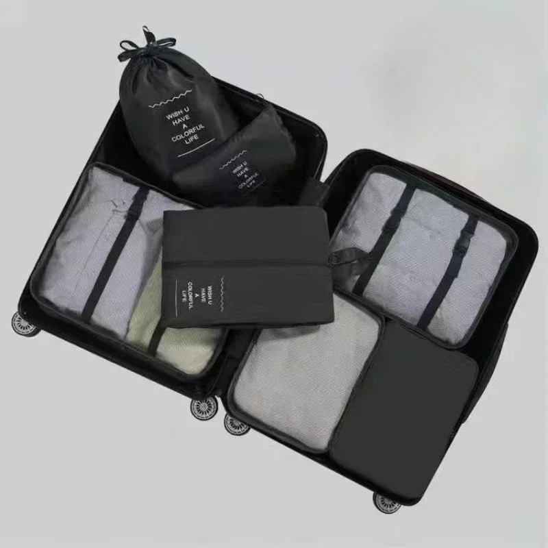 Transform your suitcase from a chaotic mess into a model of efficiency with this 7-Piece Travel Bag Organizer Set. Designed to maximize every square inch of your luggage, this system allows you to categorize your packing like a pro. The set typically includes multiple sizes of mesh-top packing cubes for clothing (allowing for ventilation and instant visibility of contents), a dedicated shoe bag to keep dirty soles away from clean attire, and specialized zippered pouches for toiletries, cables, or laundry. By compartmentalizing your gear, you not only save space but also make unpacking a breeze—simply lift the cubes out of your suitcase and into the hotel drawer. Constructed from lightweight, water-resistant fabric with high-quality zippers, these organizers add virtually no weight to your bag while protecting your items from wrinkles and movement during transit. Whether you are packing a carry-on for a weekend trip or a large suitcase for a family vacation, this set ensures you spend less time digging for socks and more time enjoying your travels.