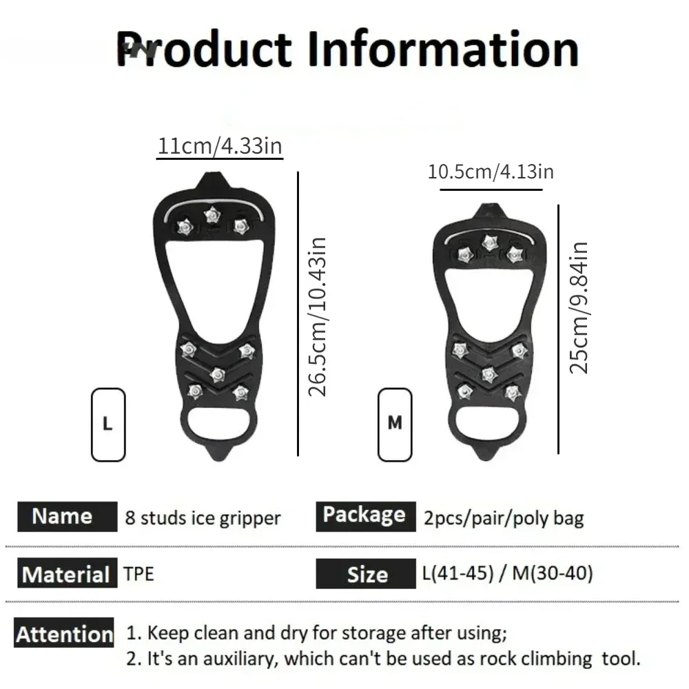 Conquer winter terrain with confidence using these durable 8-tooth ice grippers. Designed for outdoor enthusiasts, these crampons provide superior traction on dangerous icy and snowy surfaces. Each cover features eight high-strength steel spikes that bite firmly into the ground to prevent slipping. The flexible TPE rubber material stretches easily to fit securely over most hiking boots, sneakers, and casual shoes. They are lightweight and highly portable, making them perfect for carrying in your pocket or backpack until needed. Ideal for winter hiking, mountain climbing, or simply walking safely on icy driveways. The easy-on, easy-off design ensures you can attach them quickly when weather conditions change unexpectedly. These anti-slip shoe covers effectively reduce the risk of nasty falls and injuries during cold weather activities. Built to withstand extreme temperatures, the rubber remains elastic and durable without snapping in the cold. Stay safe and active all winter long with these essential anti-slip traction cleats.