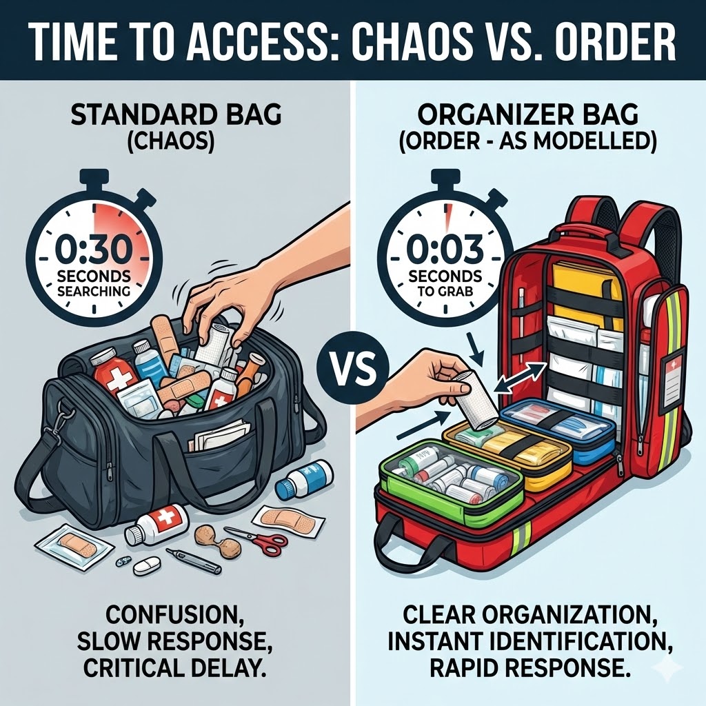 Prepare for the worst-case scenario with this Disaster Relief Backpack, engineered for rapid deployment during floods, earthquakes, or mass-casualty events. The core advantage of this bag is its “Classified Storage” system; the interior is meticulously designed with multiple transparent pouches, color-coded sections, and elastic loops. This layout allows you to separate and categorize supplies by urgency (e.g., severe bleeding vs. minor cuts) or type (e.g., airway vs. burn care), eliminating the panic of digging through a cluttered bag when seconds count. The main compartment offers enough room to stock supplies for a family or a small team for up to 72 hours. Built with rugged, high-visibility materials and reinforced handles, it stands up to debris and rough handling in disaster zones. Whether serving as a home “Go Bag” or a professional triage kit, this medical organizer ensures that order is maintained even when the world around you is in chaos.