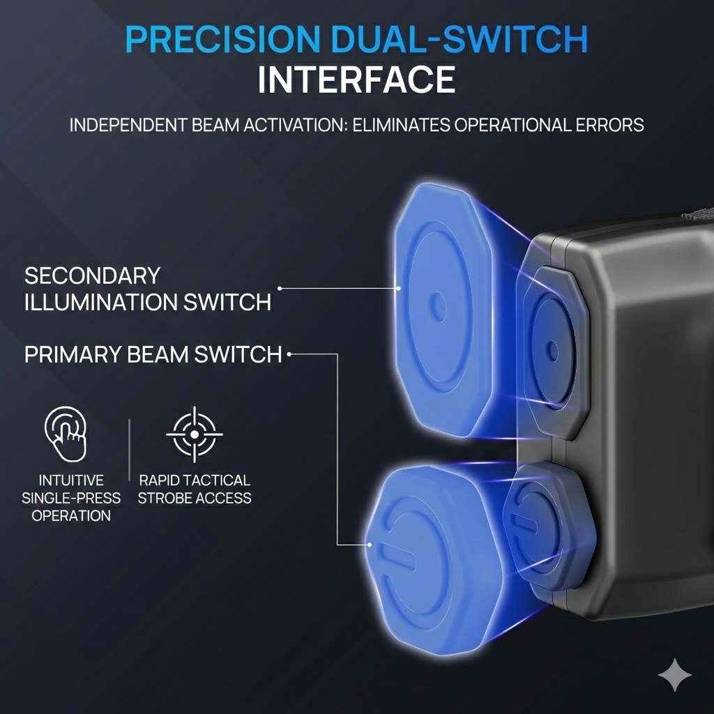 Dual-Switch Interface: Provides separate buttons for power and mode selection, including rapid-access tactical strobe.