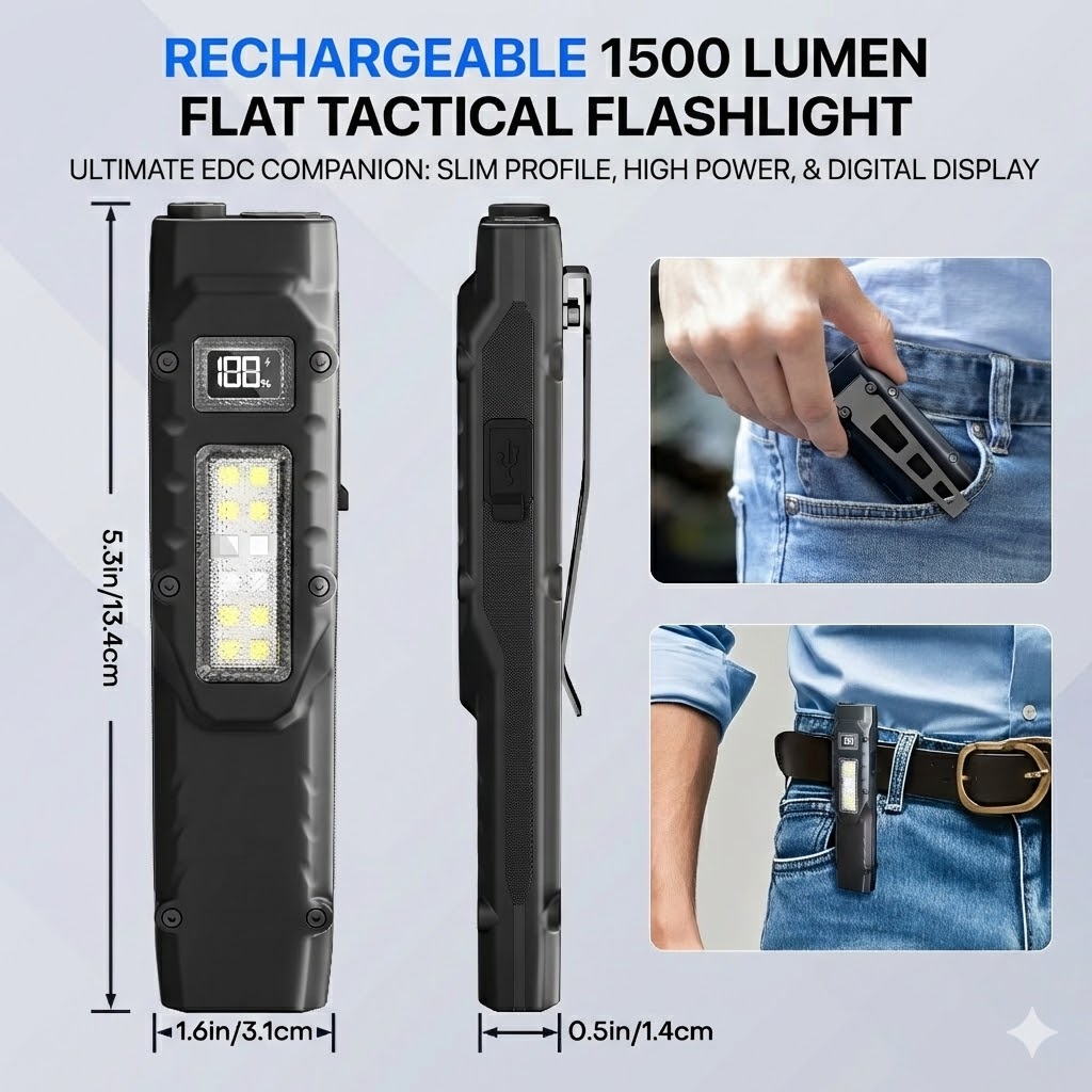 This rechargeable 1500 lumen flat tactical flashlight is the ultimate EDC companion for those who prioritize power and portability. Unlike traditional round torches, its innovative slim, flat profile slides comfortably into a pocket or clips onto a belt without adding unnecessary bulk. The integrated digital display provides real-time feedback on battery percentage and brightness levels, ensuring you are never caught in the dark unexpectedly. Dual-switch technology allows for intuitive control, offering instant access to strobe modes for tactical situations or steady beams for everyday tasks. Crafted with a premium finish and a heavy-duty stainless steel clip, this light is built to handle the rigors of professional use and outdoor exploration.
