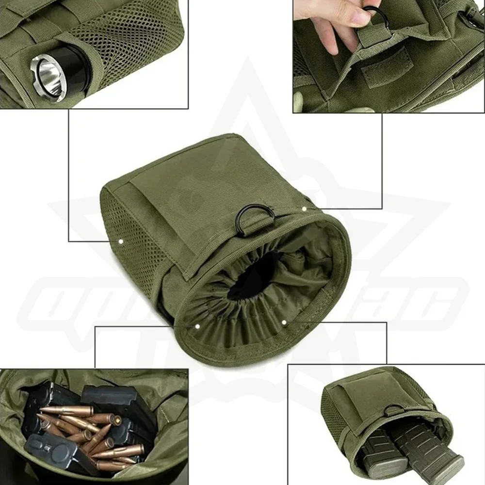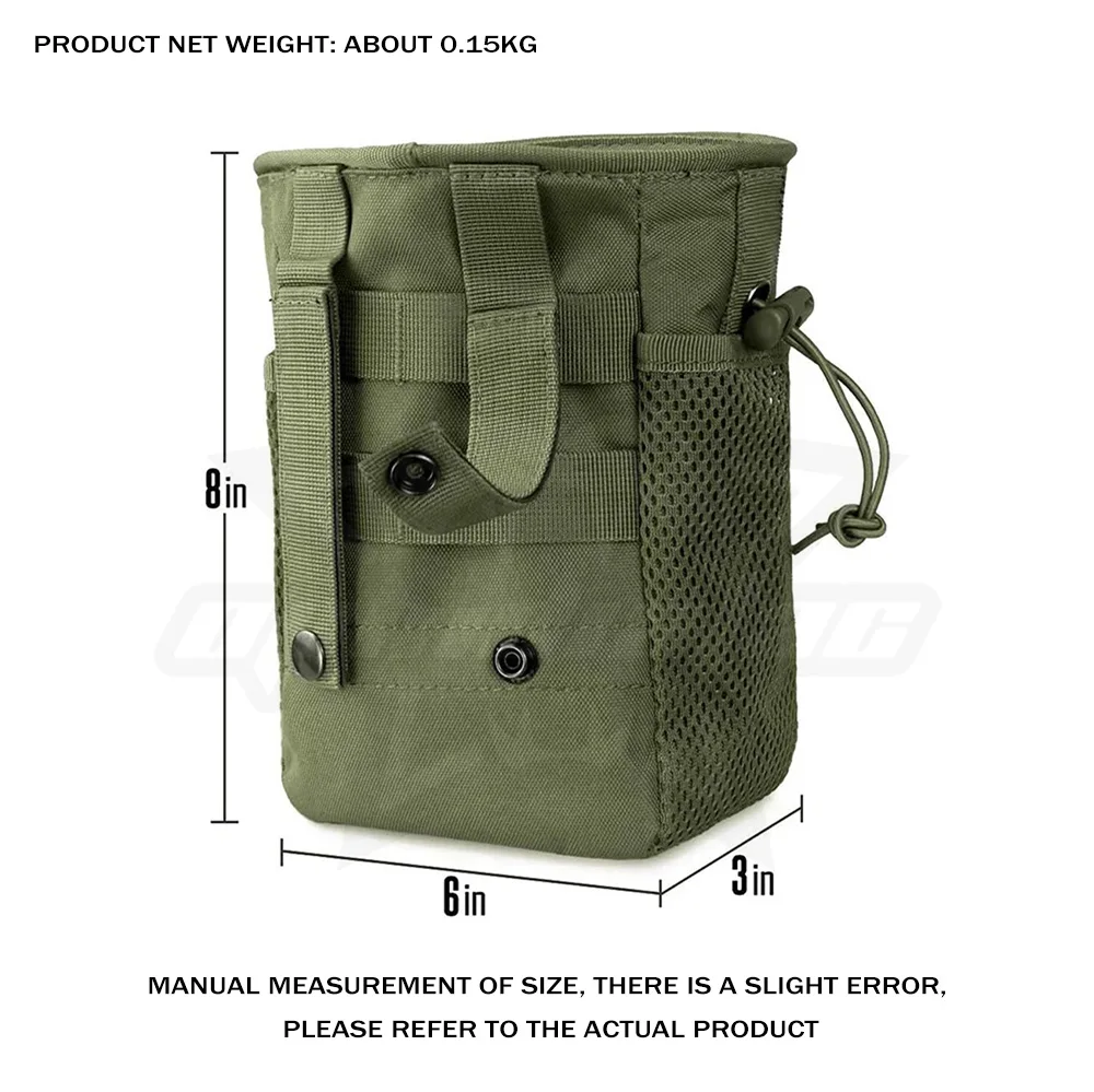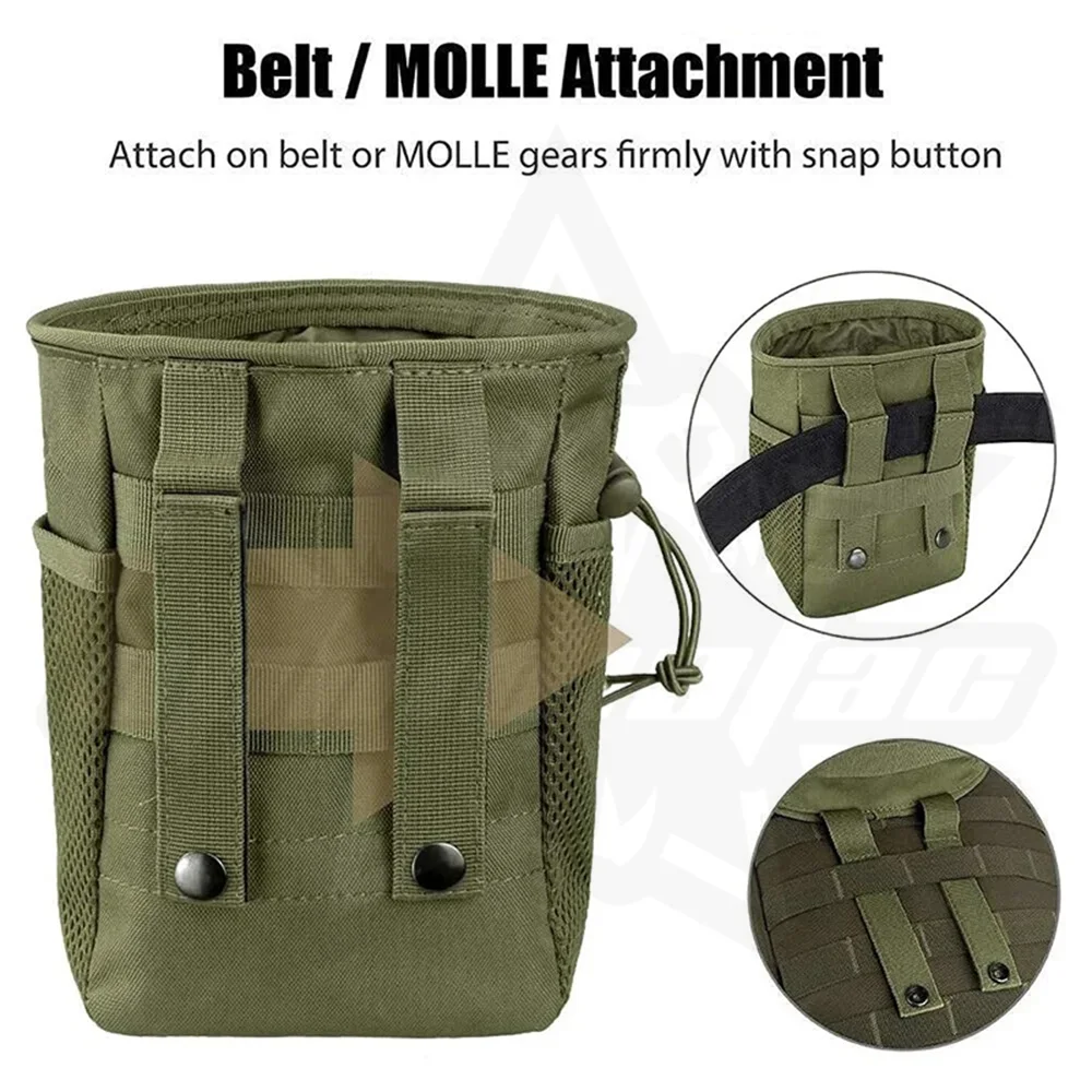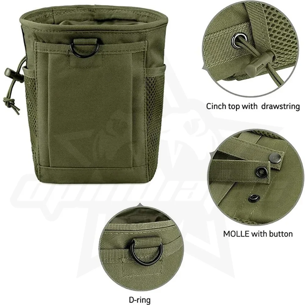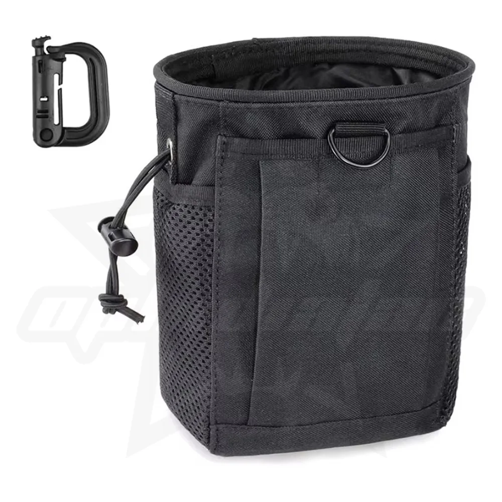 Constructed from durable, high-density fabric, it features a drawstring closure with a cord lock to secure your contents instantly, preventing magazines or shell casings from bouncing out during movement. The bag is equipped with a breathable mesh side pocket for separating small essentials or allowing debris to sift out. Versatile and rugged, it includes a heavy-duty Grimloc-style carabiner and a D-ring attachment point, making it easy to clip onto your belt, vest, or pack for holding everything from ammo to trash.