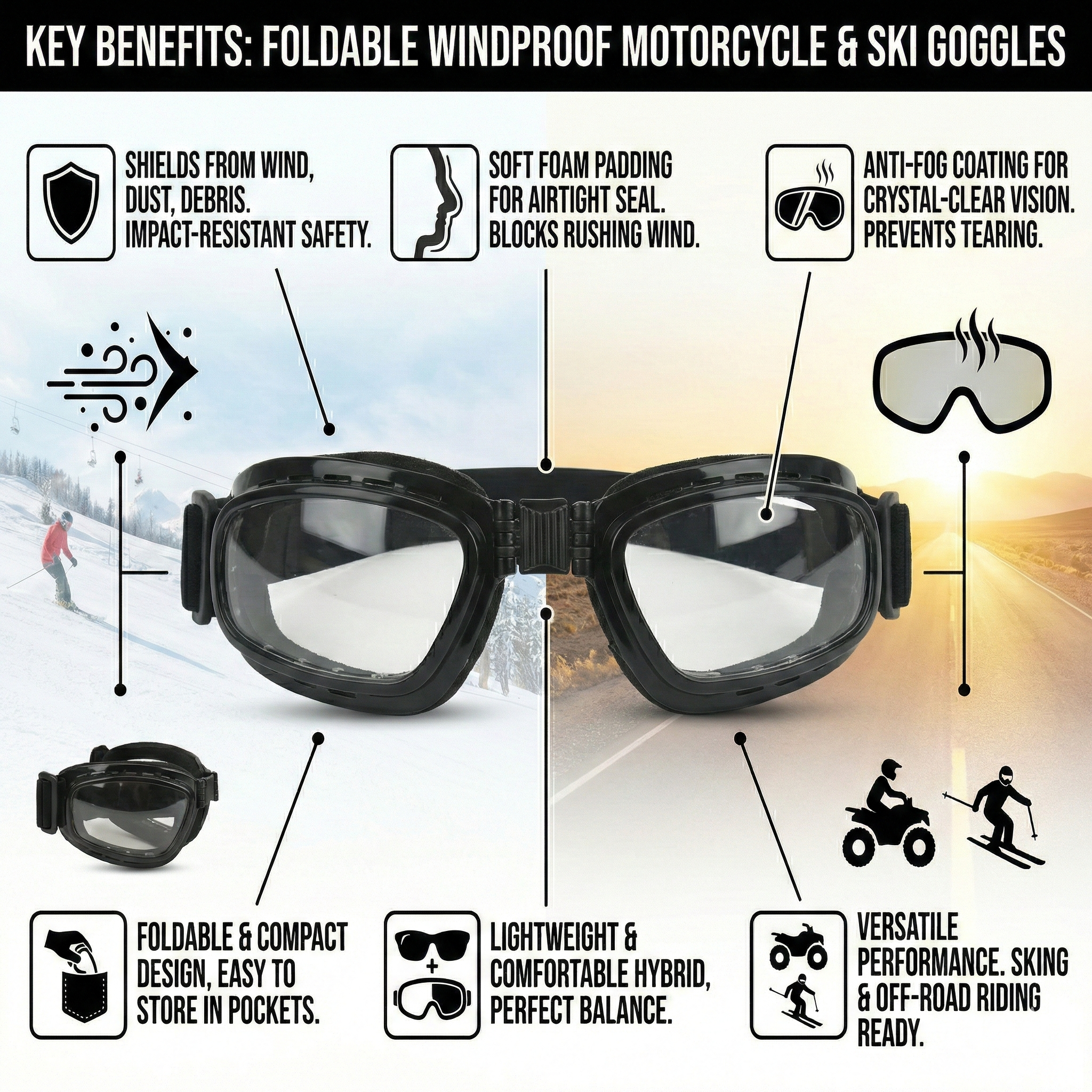 Shield your eyes from wind, dust, and debris with these Foldable Windproof Motorcycle and Ski Goggles. Engineered for high-speed action, these glasses feature a soft, high-density foam padding around the interior frame. This seal hugs the contours of your face, effectively blocking out rushing wind that causes tearing, while also preventing sand and dust from entering your eyes during off-road racing or ATV riding. The lenses are treated with an anti-fog coating, ensuring crystal-clear vision even when you are sweating on the slopes or stopped at a traffic light in cold weather. A unique hinged nose bridge allows the frame to fold in half or compact tightly, making them incredibly easy to store in a pocket or saddlebag without taking up space. Whether you are carving down a mountain on skis or cruising the highway on your bike, the impact-resistant lenses provide reliable safety protection. Lightweight and comfortable, they are the perfect hybrid between standard sunglasses and bulky motocross goggles.