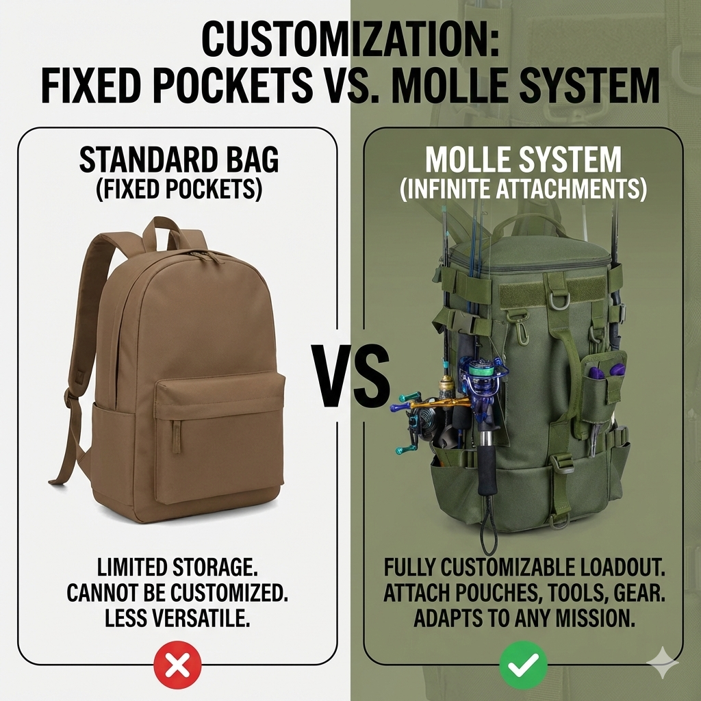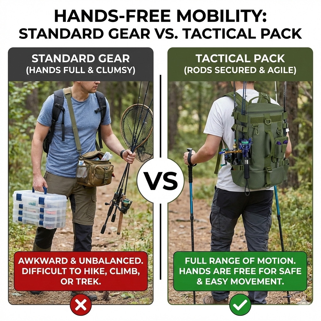 Navigate to the perfect fishing spot without the struggle of juggling loose gear. The Tactical Fishing Backpack & Tackle Bag is the ultimate solution for the mobile angler who needs to hike, climb, or trek to reach the water. Unlike clunky handheld tackle boxes, this multifunctional bag keeps your hands completely free by securing your fishing rods directly to the pack.
