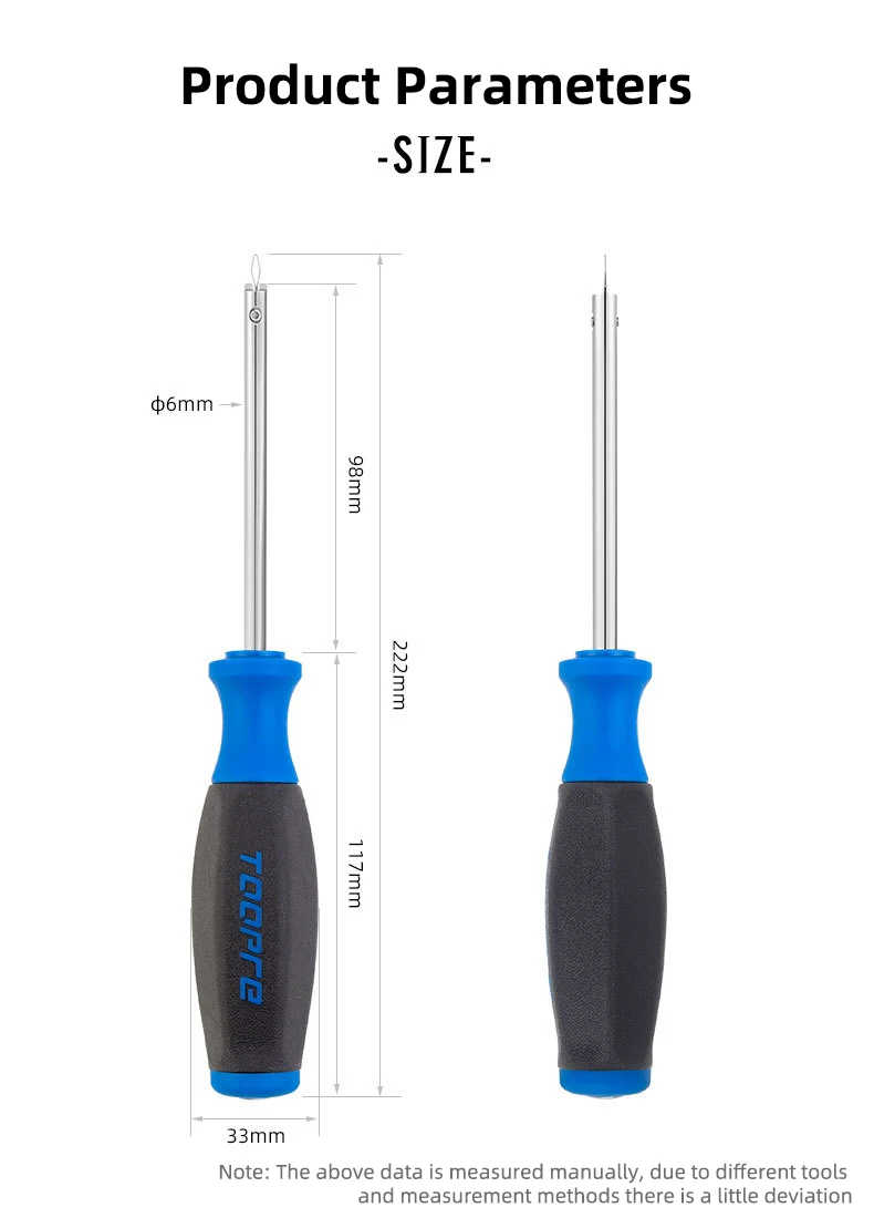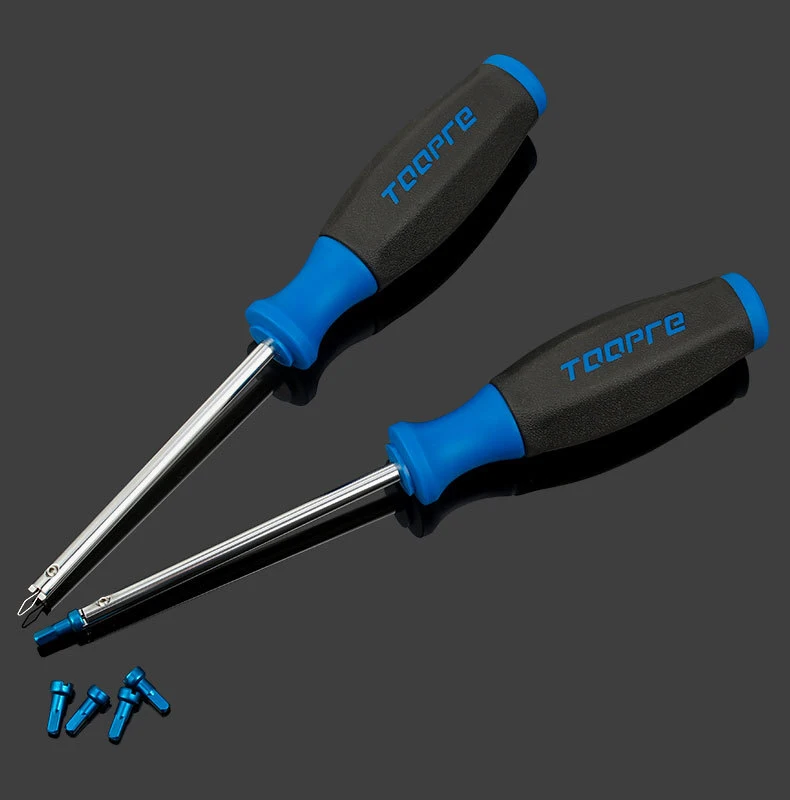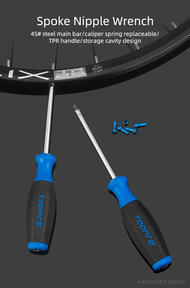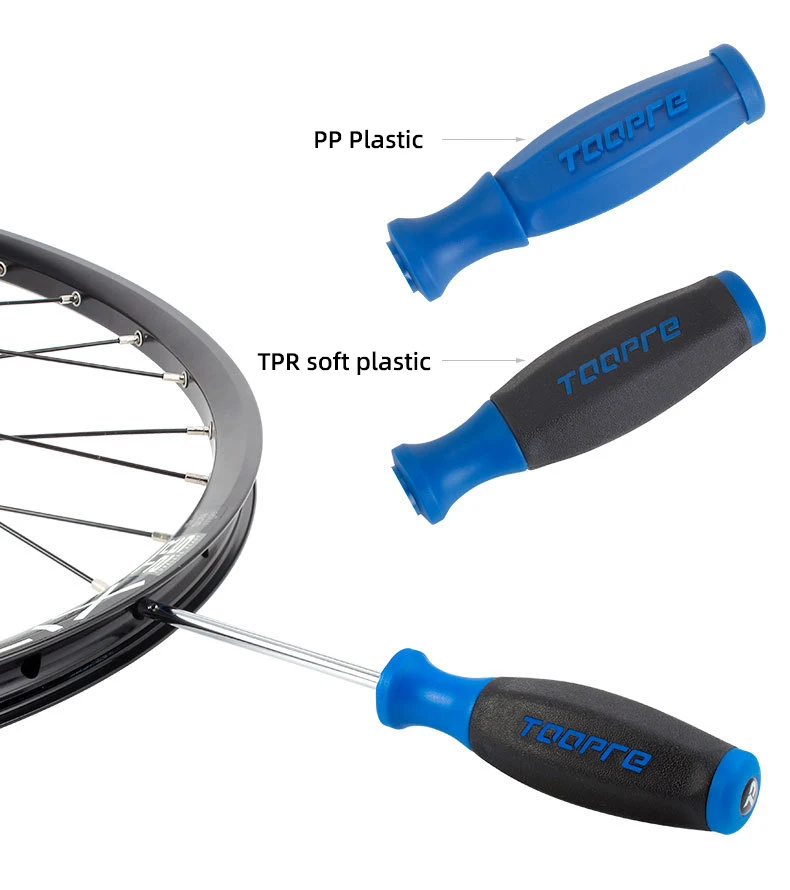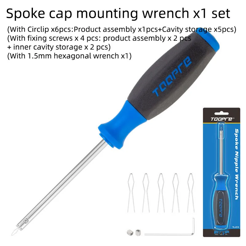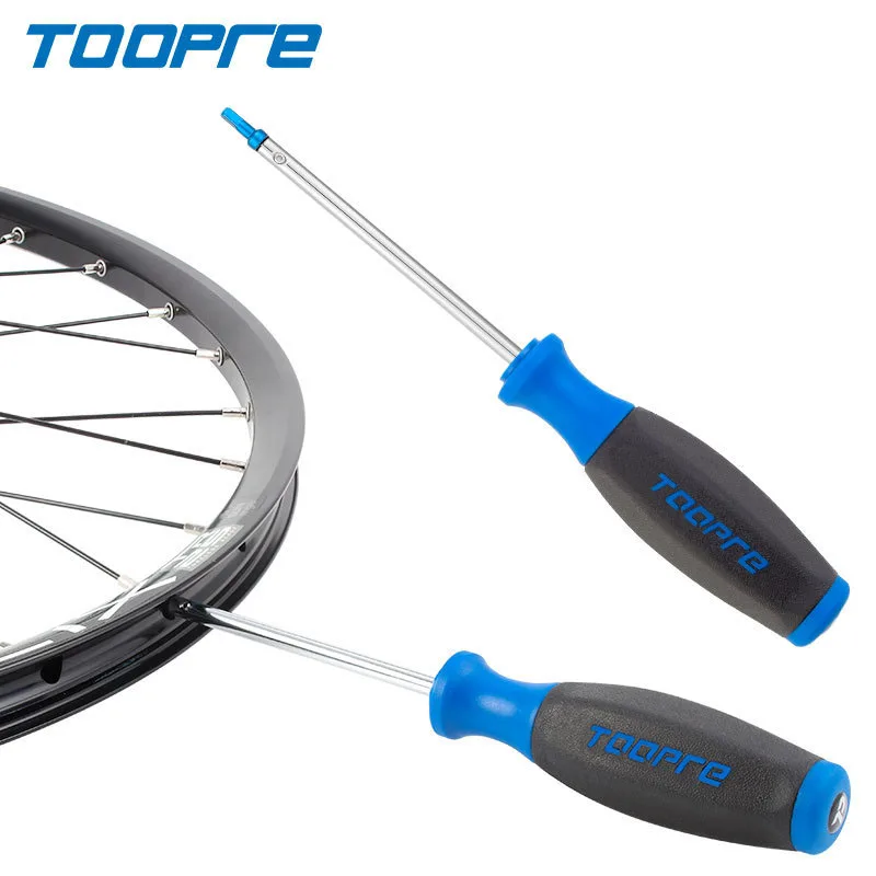 Simplify the tedious process of wheel building with the TOOPRE Spoke Nipple Installation Wrench. This specialized screwdriver is designed specifically to hold and insert nipples through double-wall rims without dropping them. The tool features a unique retaining pin or clip that securely locks the nipple in place during insertion. This prevents the frustration of nipples falling into the rim cavity, saving you valuable time and effort. Its comfortable, ergonomic handle provides excellent grip and control for precise threading. The tool is compatible with most standard spoke nipples, making it versatile for various wheel types. Constructed from durable steel and high-quality plastic, it withstands the demands of frequent workshop use. It also functions as a removal tool, allowing you to easily extract damaged nipples during repairs. A built-in storage cavity in the handle holds spare nipples for quick access. Essential for both professional mechanics and DIY wheel builders, this tool ensures a smoother, faster, and headache-free assembly process.